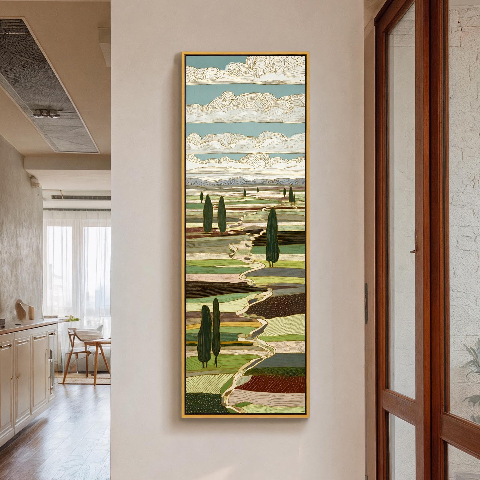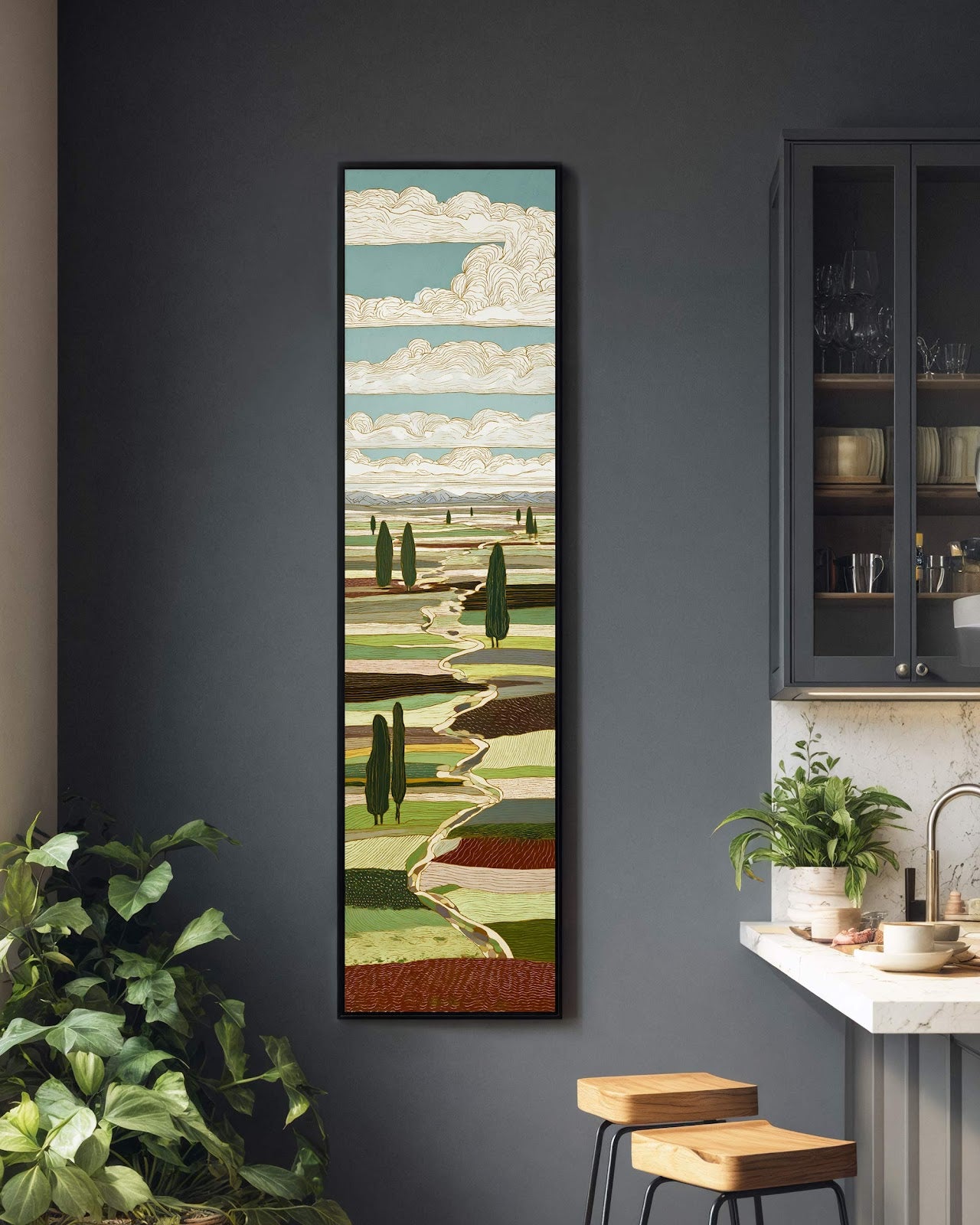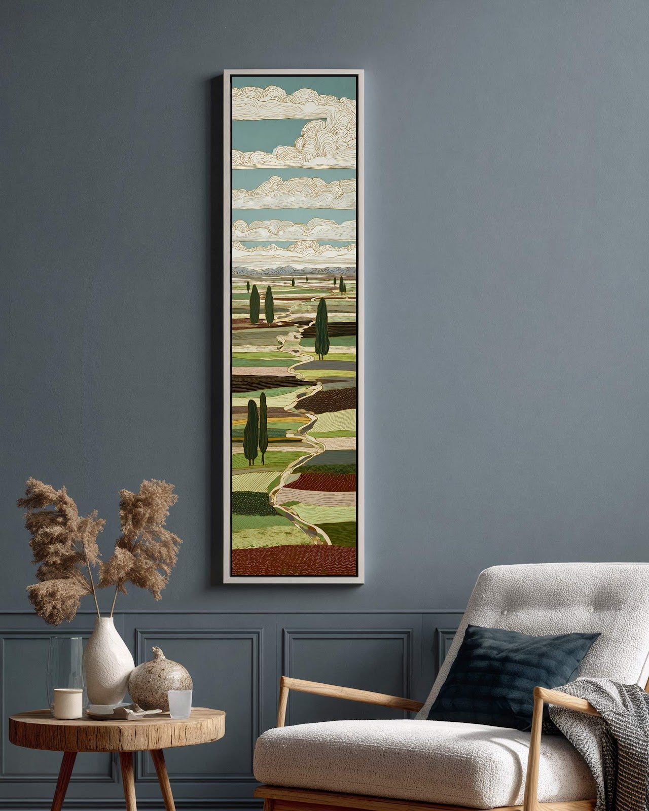 Vertical canvas wall art in interior setting.