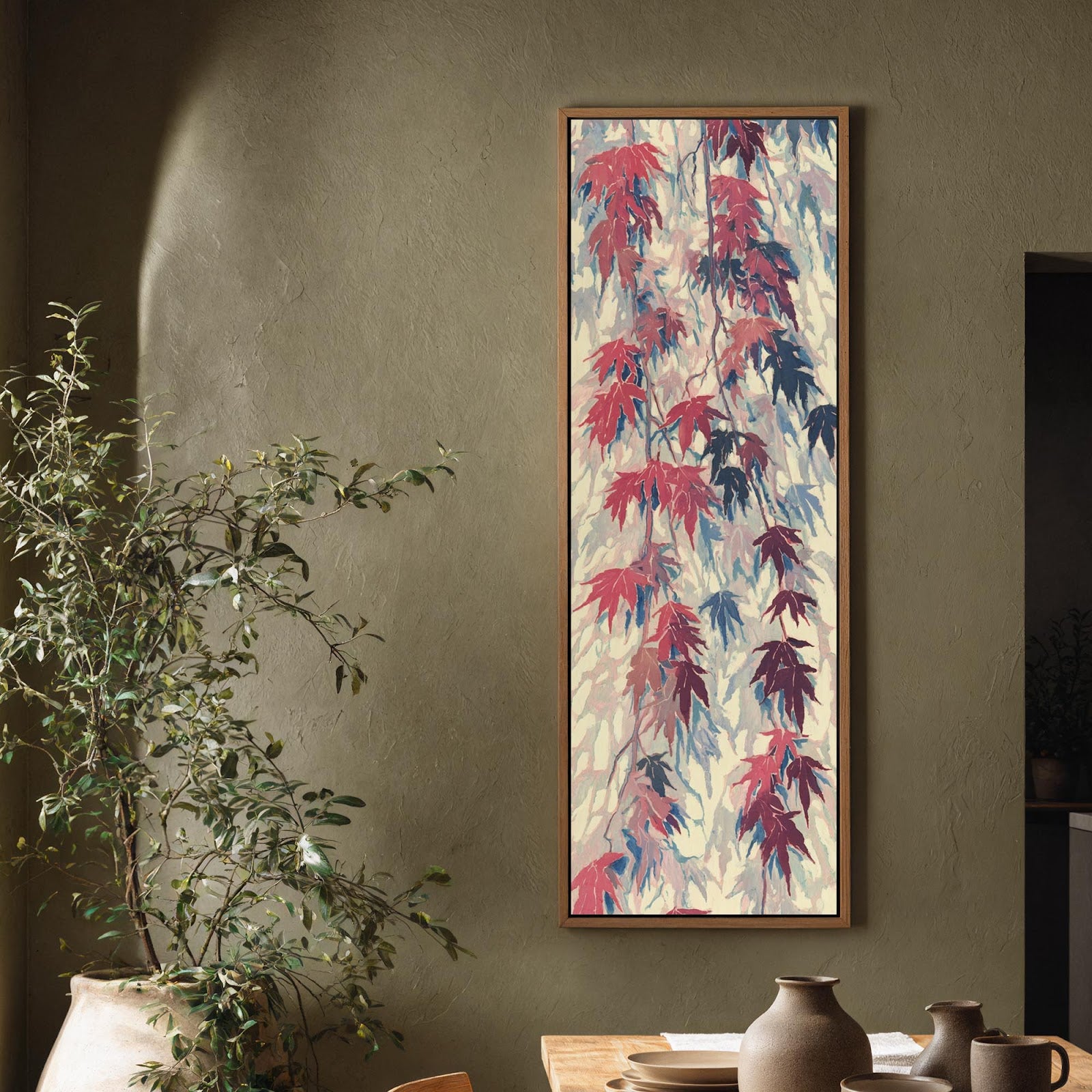 Vertical canvas wall art in interior setting.