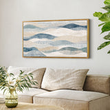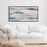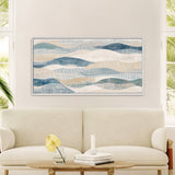 The artwork features graceful, layered bands of muted blues, warm sandy beiges, and soft whites, each adorned with distinct, hand-drawn-like textures – from delicate lines to organic stippling. This rhythmic composition creates a soothing visual flow and immersive depth, evoking the tranquil movement of natural elements. Its calming color palette and sophisticated textural details make it a versatile focal point that enhances an atmosphere of relaxed elegance and quiet luxury.