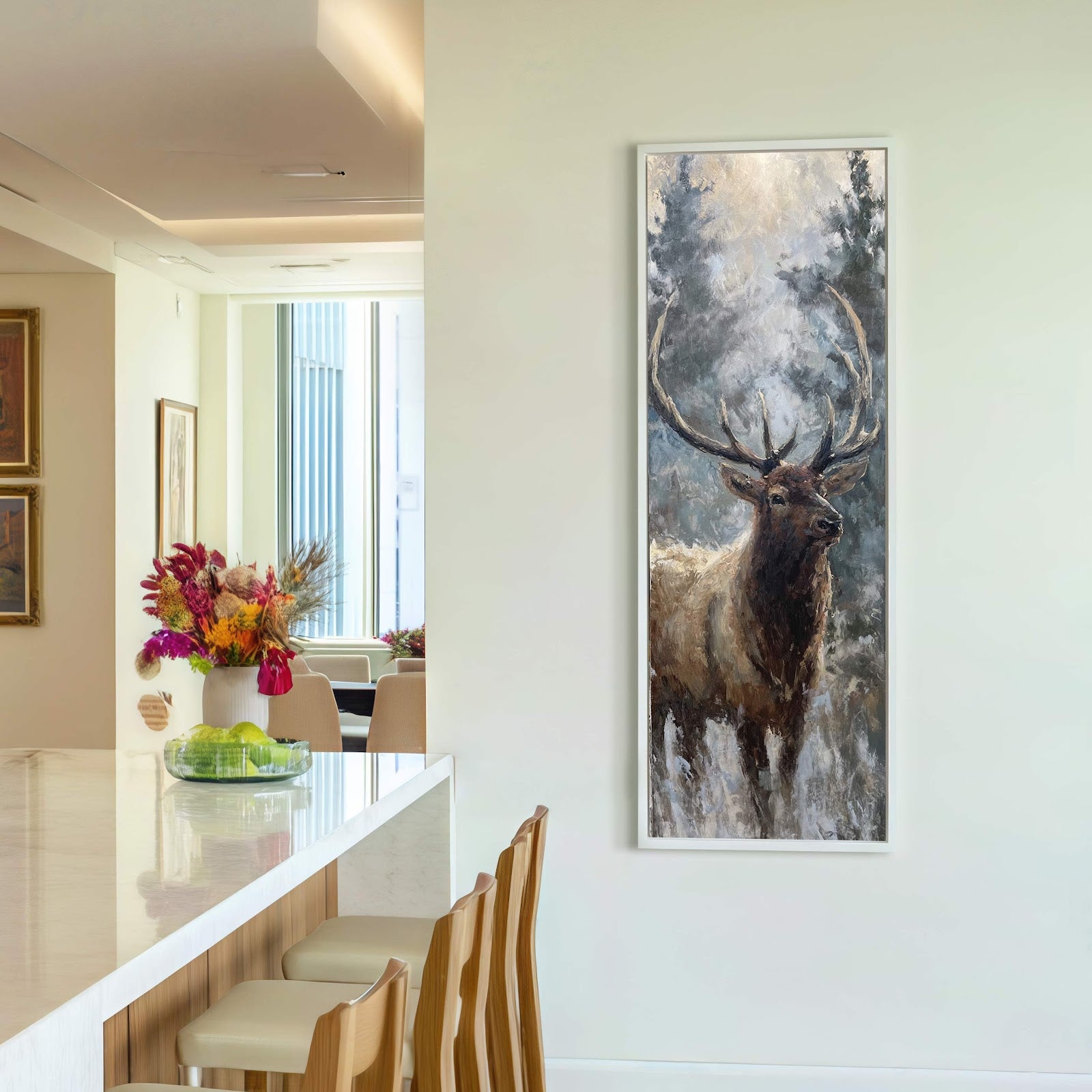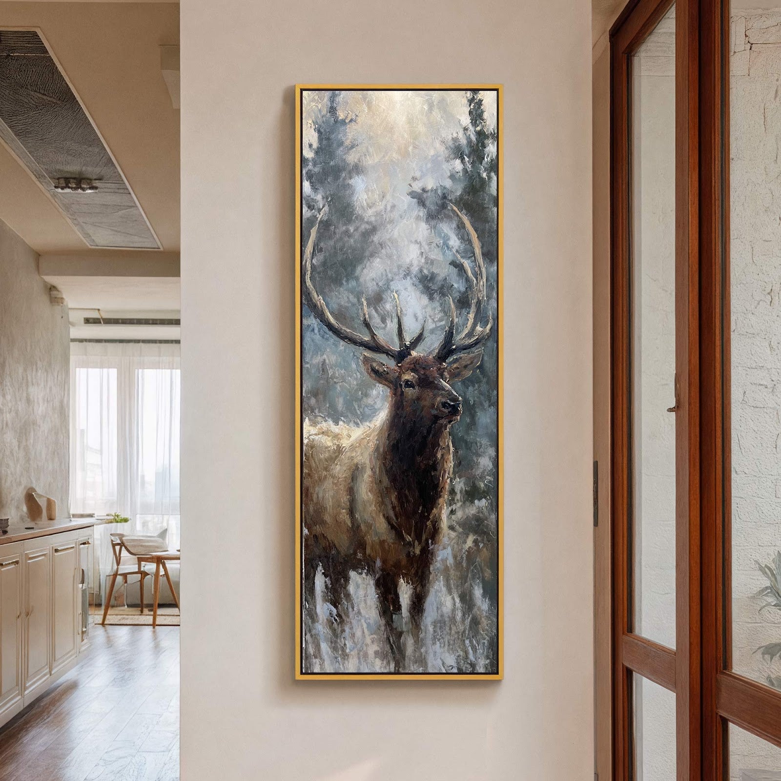 This vertical canvas wall art depicts a stag with large antlers in a moody, impressionistic style with a muted palette, hanging above a wooden console table against a light wall.
