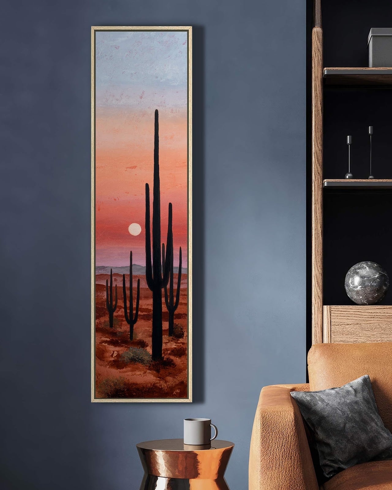 Vertical canvas wall art in interior setting.