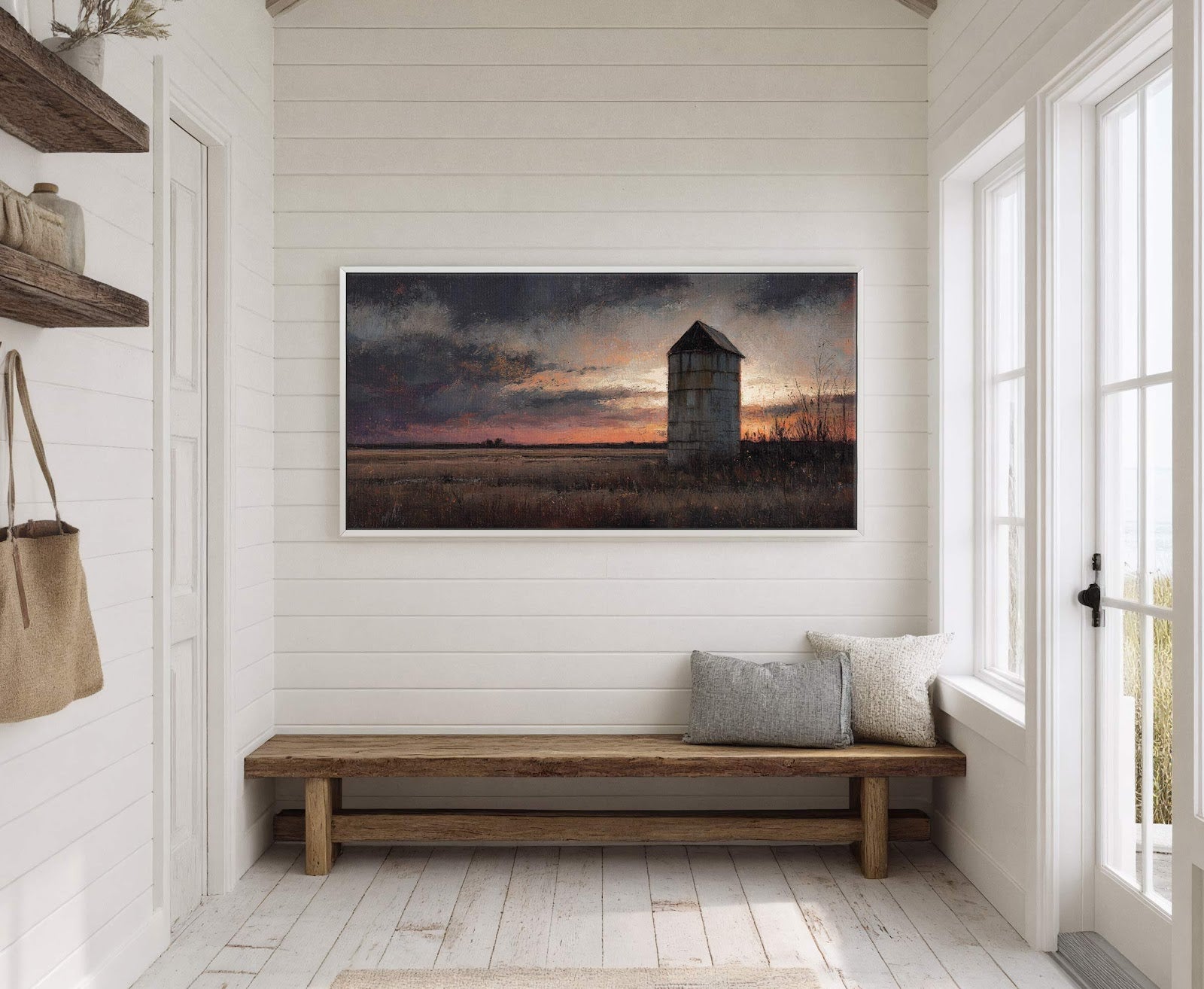 Impression sur toile « Coucher de soleil sur un silo de ferme »