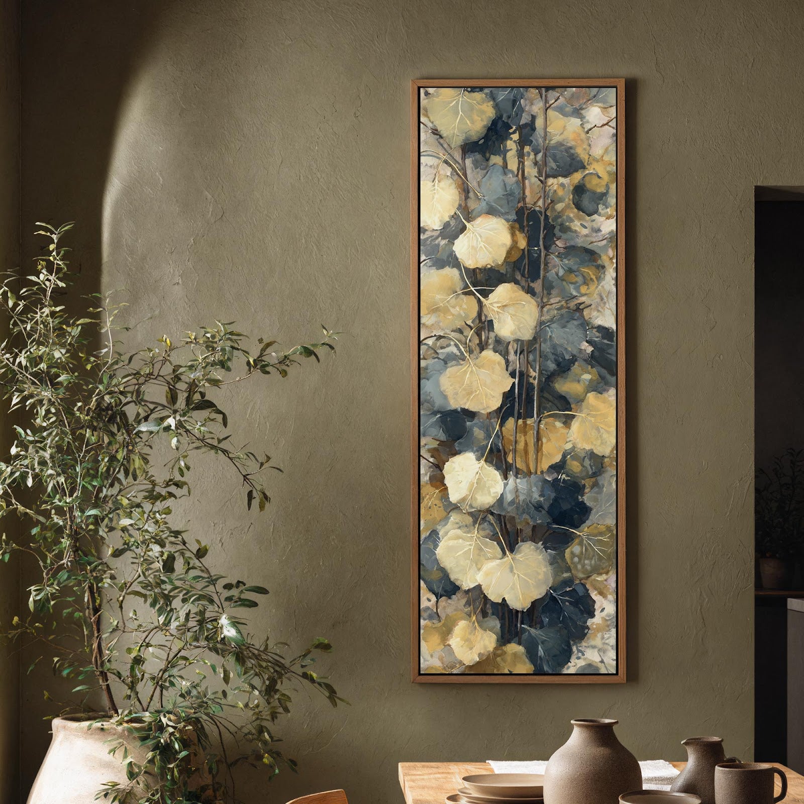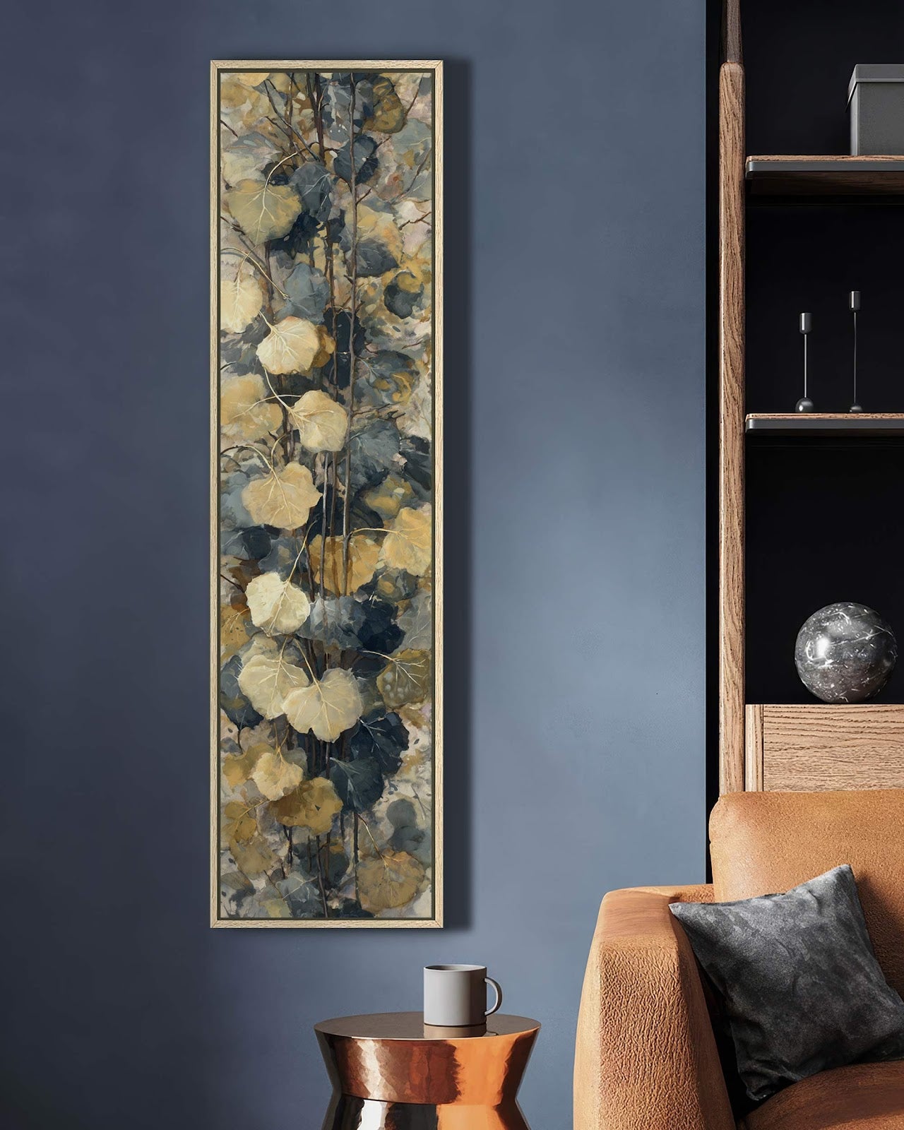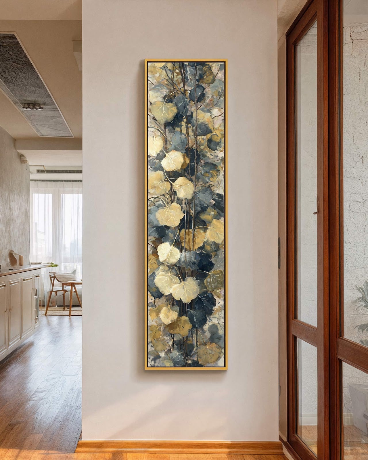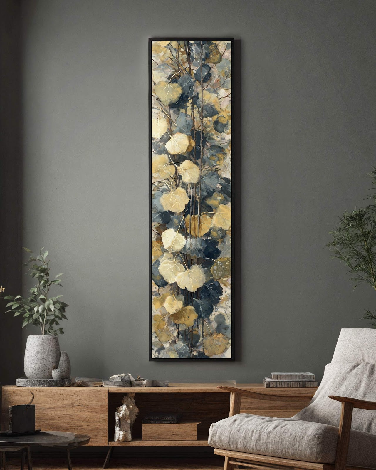 Vertical canvas wall art in interior setting.