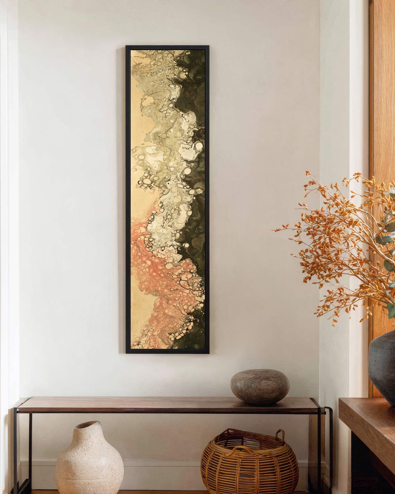 Vertical canvas wall art in interior setting.