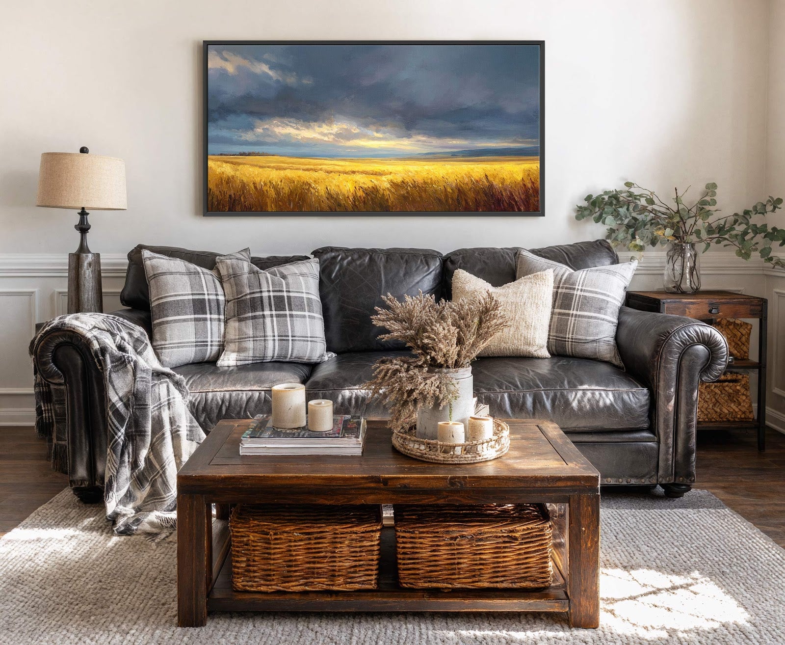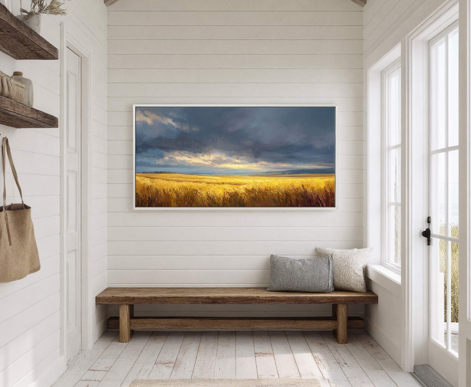 This horizontal canvas wall art features a dramatic landscape of a golden wheat field under a stormy, dramatic sky. It is displayed above a rustic wooden bench with decorative pillows.