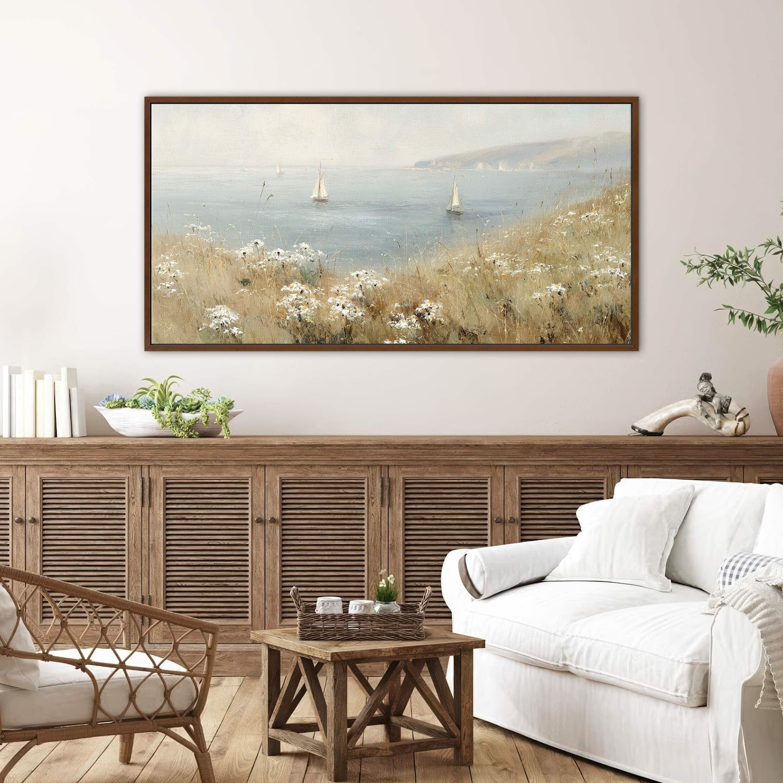 Serene Coastal Sailboats Field Flowers Canvas Print